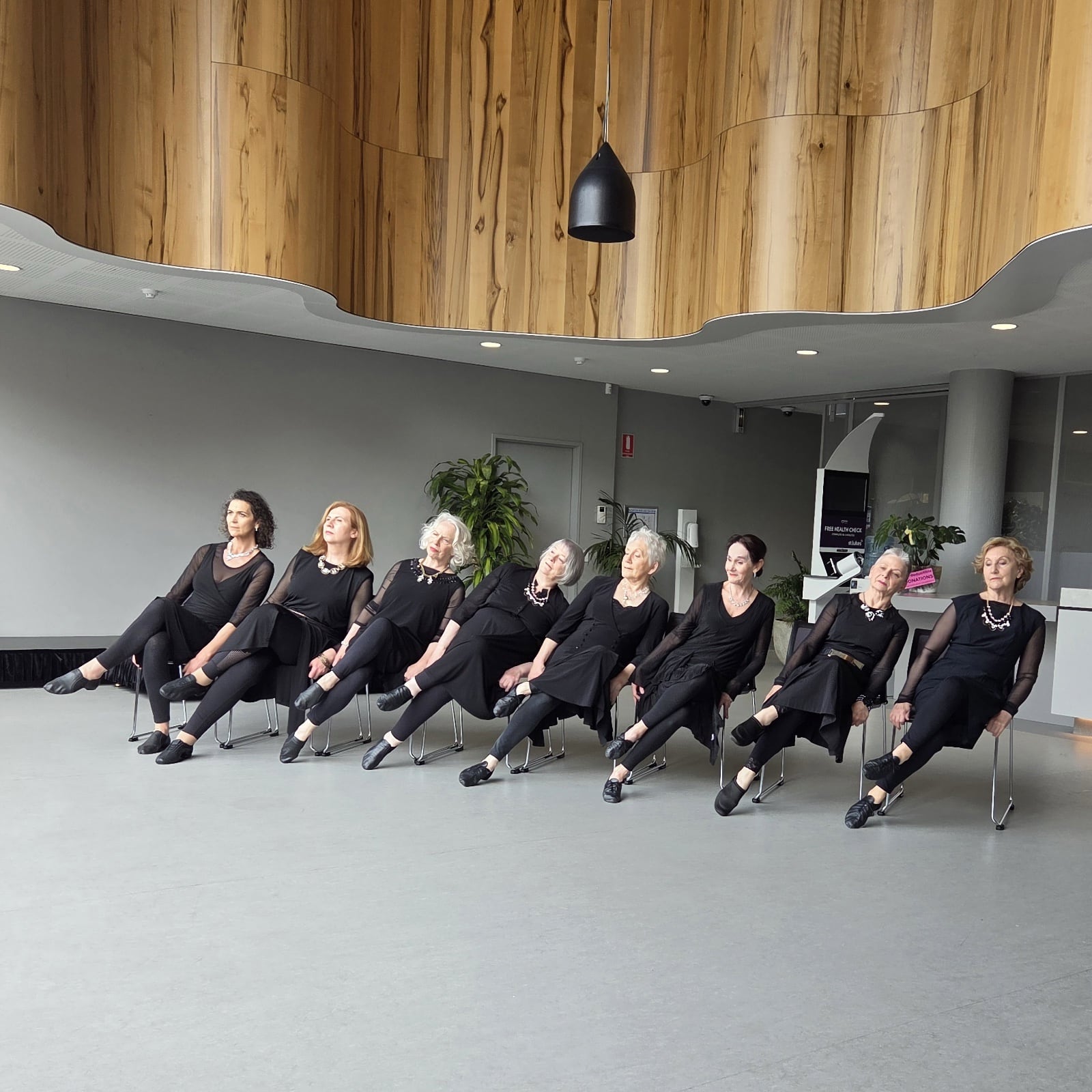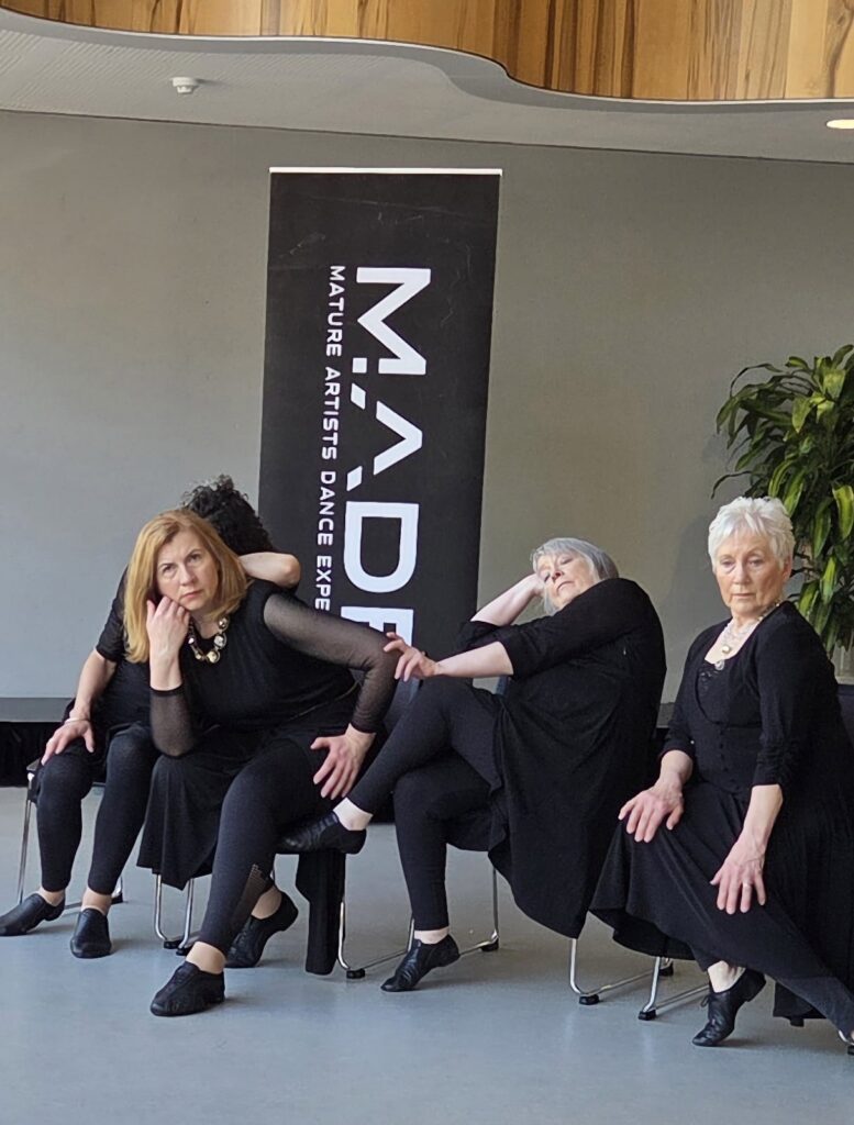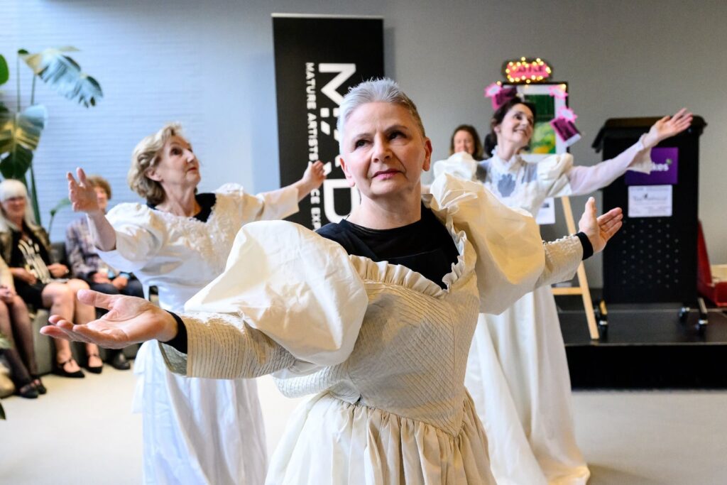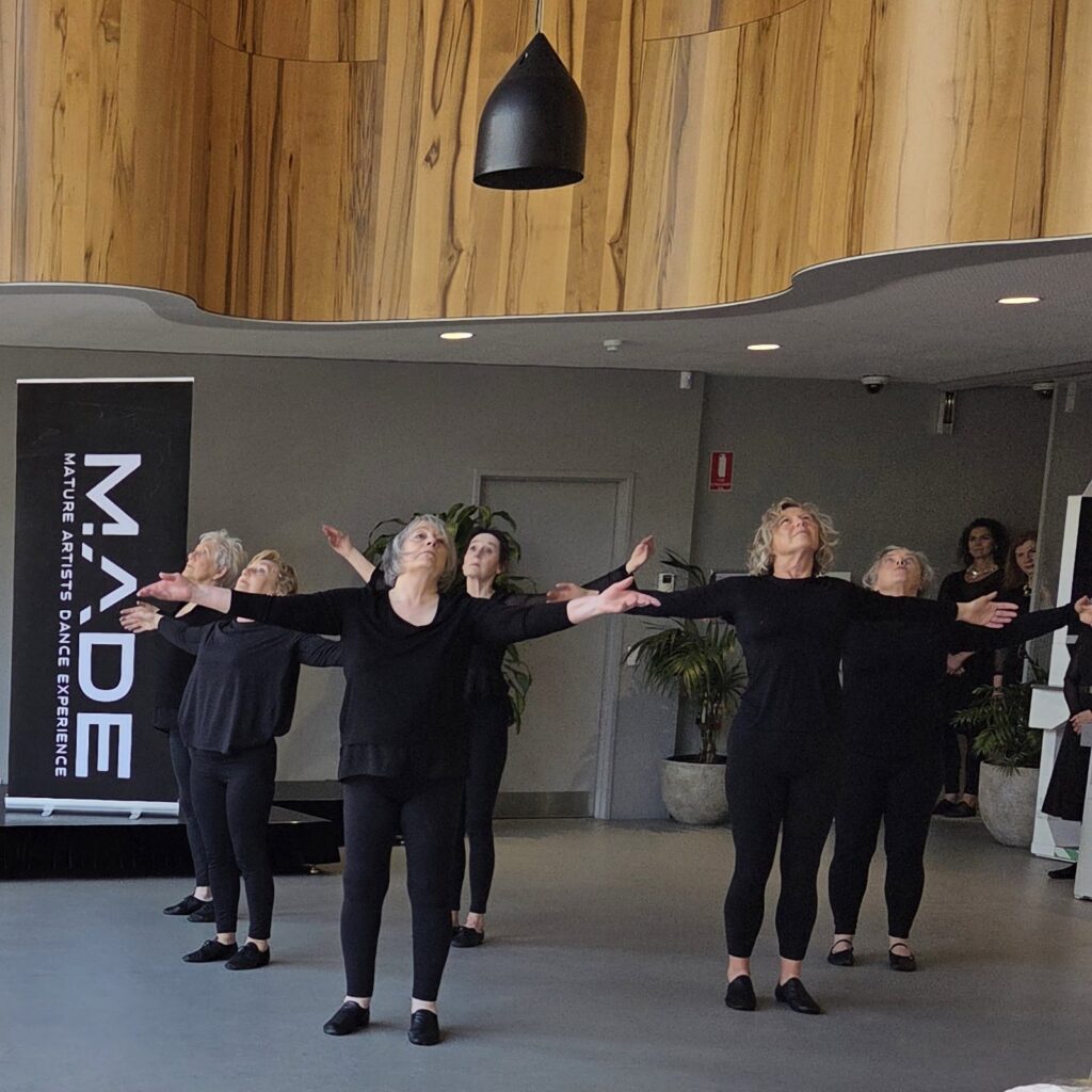 Mature Artists Dance Experience celebrated 20 years of challenging perceptions about ageing through creative expression, dance, performance, wellness and community engagement on 6pm – 7.30 pm, Fri. Oct. 31 2025. This enthusiastically supported ticketed event took place at the open, light-filled St Lukes Foyer and Wellness Hub, on the corner Elizabeth and Liverpool Streets in Hobart. MADE were joined by special guests Graeme Murphy AO and Janet Vernon AM at the Opening Night Cocktail Party featuring an exhibition opening of John Paton’s exquisite watercolours capturing moments of MADE’s signature mature dance classes.